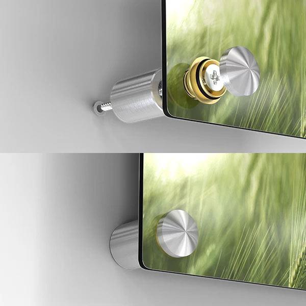 Standaard geleverd met 4 boorgaten incl. aluminium schroeven en afstandhouder. Hierdoor hangt het schilderij ca. 20mm vrij van de muur. De afwerking van de schroef is verchroomd wat een mooi stijlvol effect geeft.